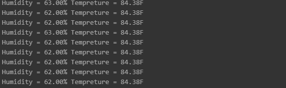 In the loop function, we are first starting off by delaying for 2 seconds. We are reading the temperature using the dht.readTemperature using the library. This gives the tempreture in Celsius. Later we converted the temperature from Celsius to Fahrenheit using the formula F=C*9/5+32. We are also reading the humidity using the dht.readHumidity function.