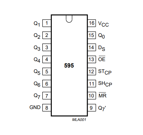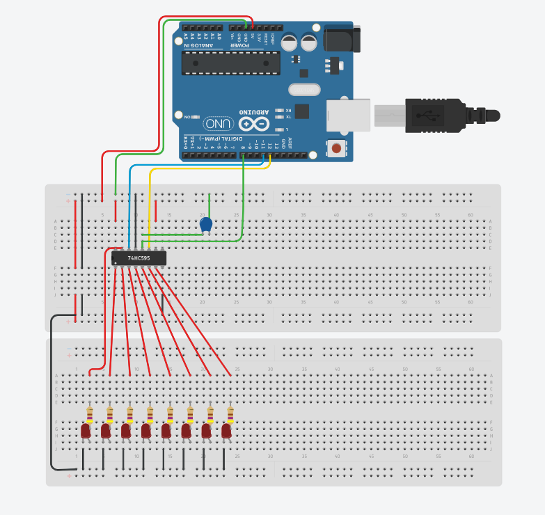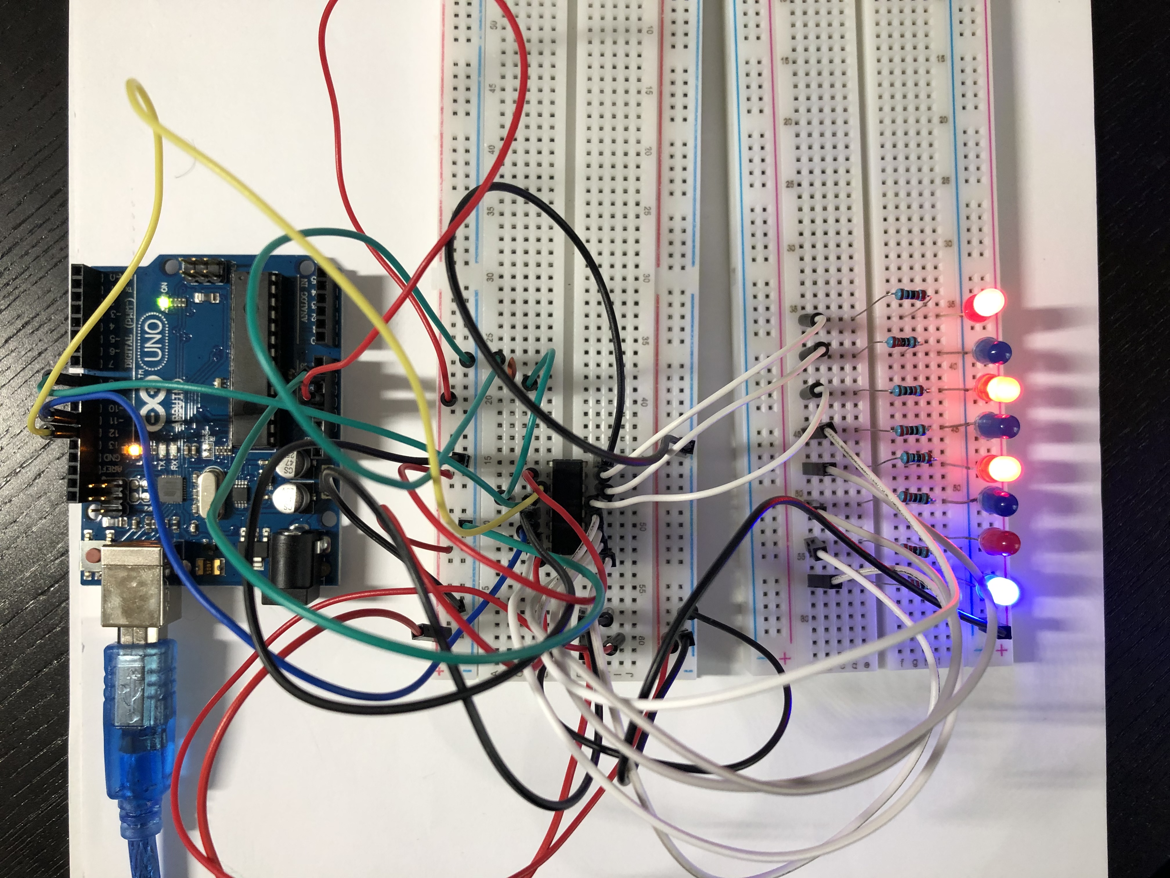 The 74HC595 shift register gives us 8 output pins. The 74HC595 shift register is connected to the Arduino board using 3 pins. One for the data, one for the clock, and one for the latch.