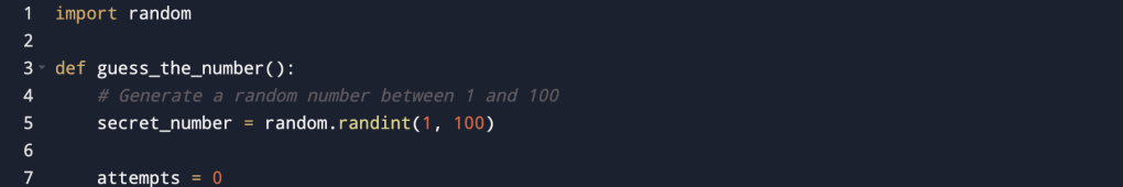 import random: Imports therandommodule for generating random numbers.secret_number = random.randint(1, 100): Generates a random integer between 1 and 100 (inclusive) and assigns it tosecret_number.attempts = 0: Initializes the variableattemptsto 0, which will be used to count the number of attempts.