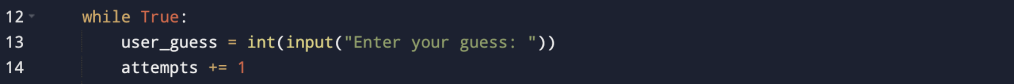 while True:: Initiates an infinite loop. The game will continue until abreakstatement is encountered.user_guess = int(input("Enter your guess: ")): Takes user input, converts it to an integer, and assigns it touser_guess.attempts += 1: Increments theattemptscounter.