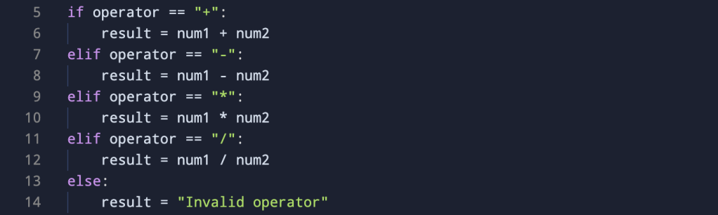 Lines 5 – 14 capture the conditional statements of the program. This block utilizes conditional statements to evaluate the entered operator and perform the corresponding arithmetic operation. If the operator is addition (+), the program adds the two numbers; if it’s subtraction (-), it subtracts the second number from the first, and so on. If the entered operator is not one of these, the program will set the result to say “Invalid Operator”.