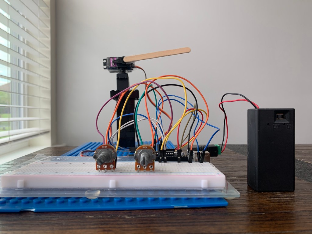 As stated above, we use 2 servo motors to build the robotic arm. The 2 potentiometers will control each of the servo motors. The images below show the robotic arm built with 2 potentiometers.